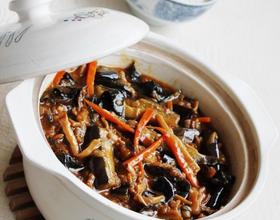 把笋丝、胡萝卜丝和木耳丝炒熟后,放入炸好的茄子条,调入生抽、老抽、盐、白砂糖和高汤。大火烧至茄条入味且全熟时,调入鸡精,随后用水淀粉勾薄芡,淋入香油。盛进事先烧烫的小砂锅(煲仔)内,加砂锅盖,小火焖5分钟,趁热上桌即可食用。