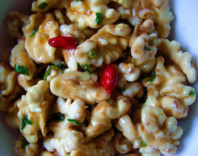 剥好后的核桃仁放入容器中,加入老陈醋、盐、生抽、白糖、香油、切碎的葱、凉拌。为了色彩好看,再放两个枸杞。