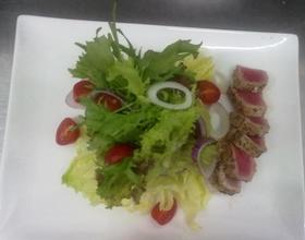 先拿少许生菜做好一个形状在撒你喜欢的配料只要自己喜欢什么都行