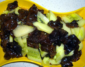- 6. 把泡发的木耳撕扯成适当大小的块并且洗净,放入锅中加水煮熟。捞出控水待用。