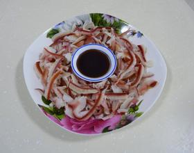 吃的时候,用北极贝裙边蘸着蘸料吃就可以了。好爽啊。也可以把蘸料浇在北极贝裙边上吃。