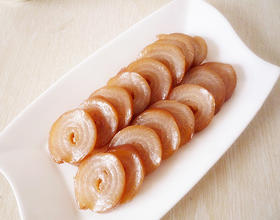 - 1. 肉皮刮去上边的白油,冲洗干净,过水焯软。