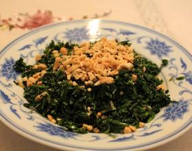 花生捣碎,将调好的蒜泥倒入山菜中,再将花生碎洒在顶部