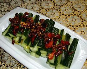 炒好的辣椒酱冷透后泼在黄瓜上即可。