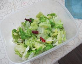 把泡好的干辣椒加入圆白菜里,拌匀即可
