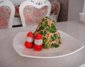 - 8. 把山药球放在切开的草莓中间,再用牙签把草莓和山药泥穿在一起固定,做成雪人,拜访在圣诞树旁边,再把千岛酱淋在圣诞树上即可。