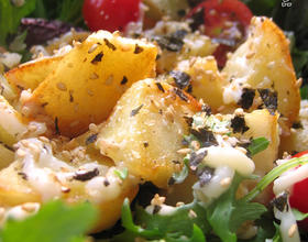 蔬菜上放煎好的土豆、蛋黄酱、熟芝麻、海苔碎,拌匀即可。
