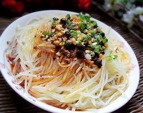 原料图,土豆去皮刨丝,素鸡切片,蒜切末,葱切碎。