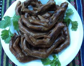 鸭掌放入煮锅,八角、桂皮、大蒜籽、生姜片、冰糖粒、盐、生抽、老抽、料酒、鸡精各适量,入水没过鸭掌
