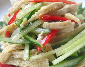 水面筋、红辣椒和黄瓜分别切粗丝。