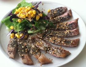 锅里放少许油,将牛排煎至自己喜欢的熟度。切块摆盘。