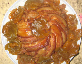 - 5. 把雕梅依次覆盖在肉片上,雕梅要把肉片基本盖完。