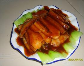 - 5. 把煎好的肉切成5厘米宽0.5厘米厚的片均匀的码放进碗内,同时到人一品鲜酱油,盐少许,鸡精,料酒,放入大料一棵,葱段,姜片!上屉蒸一个小时~