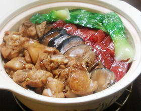 - 11. 继续保持小火,再焖15分钟。鸡肉颜色变浅,再焖3分钟即可。记住鸡肉码放的时候只能码一层。否则就会不熟。 焖鸡肉的时候,可以将菜心洗干净,热水加油、盐,汆烫熟了。 沥干水分,备用。 准备碗汁,烧开,烧粘稠。把大料捞出,倒入碗中,备用。煲仔饭好了之后,倒入碗汁、拌匀即可。