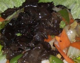 - 7. 把黑木耳和白菜、小尖椒放入锅内、加少许五香粉、酱油一勺、盐半勺、白糖一勺翻炒几下就可以出锅了。