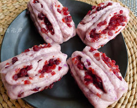 - 2. 将面团排气,放入紫山药泥,和成带紫色的面团。