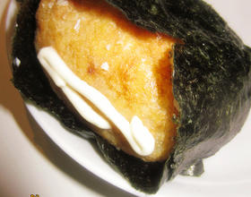 - 7. 然后用一点点米饭粒将紫菜包住饭团,再在上面轻挤一点沙拉酱即可。
