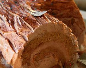 - 16. 取消蛋糕卷的两边,切成一大一小2段,摆成树桩的造型。