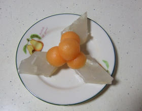 蒸至呈透明状即可,切块装盘。上面放了几个哈蜜瓜球装饰