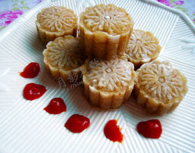 盘子里撒上糖霜,月饼磨具里也要撒上糖霜,然后将炒好的花生蓉用月饼模具按压成型即可。