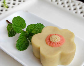 把包好馅料的红薯团放入花朵模具里压出形状。(模具抹上一层融化的黄油)