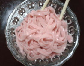 第一次尝试做这个面条还是比较成功的。要说明的是取苋菜汁是要挑紫色的叶子,挤出的汁颜色深。面团要和稍硬一点,200克面粉用90克汁正好(用厨房秤称),做出的面条韧性好。