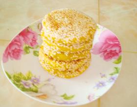 包入豆沙馅,再按成饼状,放入白芝麻中两面粘满白芝麻;