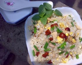 另下油炒一下白饭,用2调羹的水把盐和鸡粉溶在一起,调入白饭里,炒均匀,再与之前炒好的鸡肉粒和红枣粒、菲菜花和蛋碎混合