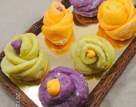 - 6. 面粉过筛,然后分别将菠菜汁、胡萝卜汁与紫薯泥倒入面粉中,加入适量白糖、少许色拉油和酵母水,充分揉和成光滑的菠菜面团、胡萝卜面团与紫薯面团,盖上湿布,置温暖处发酵