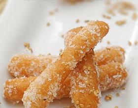 成功做江米条4要点:1.加入适量麦芽糖,可使江米条内部组织呈蜂窝状,吃起来更加爽脆香甜。2.分两次加入面粉,2/3用开水烫熟,1/3干粉再与烫熟的面团揉在一起,这是使江米条口感酥脆的关键。3.炸江米条的时候,要凉油下锅,并且要小火慢慢炸。不然外面炸糊了,里面还没熟透,而且炸出来的江米条,形状不规则。4.炸完江米条控油后,趁热先裹一层白糖再裹一层白芝麻,不热就裹不上了。裹白糖也可改为裹糖浆,用水加白糖熬成粘稠的糖浆,裹在江米条上,再蘸白芝麻,晾凉就可以。