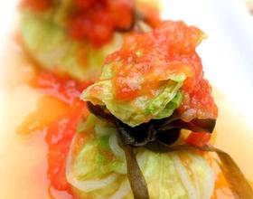 - 15. 把白菜叶周边收起,用大拇指和食指捏住,形成个小菜包。