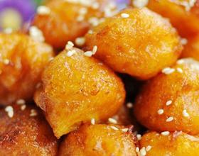 用大拇指和食指的虎口处挤成大小均称的丸子,放温油中小火炸至全部在油中浮起,呈金黄色。