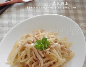 里脊肉切丝,加姜丝、蚝油和食用油拌匀。