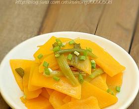 南瓜切成薄片后,在水中浸泡一下,去除部分南瓜淀粉,使其口感更清脆。用香葱炝锅,凉油煸炒香葱,葱的用量要多一些,葱的香味融入到油中,再炒南瓜片,自然就吃不出生南瓜的味道了。炒南瓜片的时候倒入适量白醋,既可以防止南瓜粘锅,又能使南瓜片口感更加清脆。