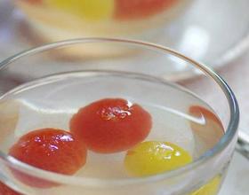 待糖水凝固以后,放入小西红柿,再倒入剩余的糖水,再次放入冰箱内冷却。