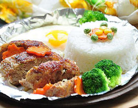 将肉饼码放在铁板上,将胡萝卜青豆、玉米洒在铁板上。