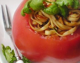 - 14. 拌好的面条再盛进番茄做到小碗里面就可以。