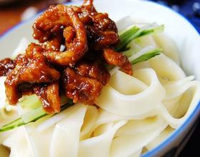 - 13. 将黄瓜、葱丝添入面碗中,加入酱爆鸭丝即可。
