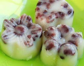 把放凉的杏仁露倒入放有红豆的模具中,放冰箱冷藏至硬即可。