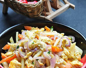 洋葱切丝,土豆切粗条、胡萝卜切粗条,鸭蛋打散。