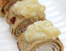 蟹棒去掉表面的保鲜膜,用煎好的香蕉薄饼卷好,切段即可。
