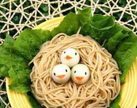 鹌鹑蛋煮熟后剥壳,在顶部切个小口,将小菱角胡萝卜片夹在切开的小口上做小鸟的嘴巴,用黑芝麻做小鸟的眼睛,将做好的小鸟放在面条中间的小窝上即可。