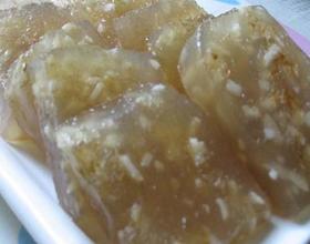 舀一大勺刚煮沸的糖水倒入粉浆中,搅匀后,再将粉浆倒入剩余的糖水中,顺时针搅拌至粉浆成生熟浆状。此时的粉浆可以感觉到有一定的黏性了。快速加入切好的马蹄丁,搅匀。
