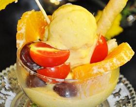 - 9. 先取1个冰淇淋球放入杯中,将提子,香蕉片,澳橘片,小西红柿片至于芒果冰淇淋球旁边。在上面再放一个芒果冰淇淋球,再用小伞和鸡蛋卷装饰一下即可。