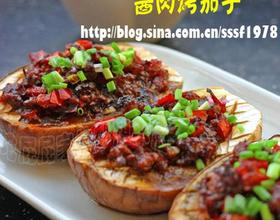 - 6. 将茄子切面朝上,将酱肉料均匀的盛放在茄子上,烤箱预热,180度,上下火,20-25分钟即可。