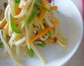 为了每天给他吃足够的蔬菜,俺很多时候都会把很多蔬菜炒在一起。但前提是要混合他喜欢吃的蔬菜才行。今天做的这道菜简单又爽口,在颜色也比较引起眼球的。想不到好听的名字,俺就随便叫了一个五彩丝吧。