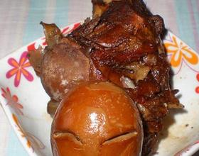 锅内重新加水,将焯好的骨头放入,再加入原料4,大火煮开后转中小火炖煮3-4个小时,出锅前加盐调味卤蛋放入锅内一起炖煮。