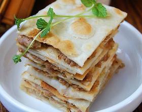 - 10. 将生坯轻压成饼,撒上面粉,用擀面杖来回轻压至薄。敢(轻压不要将肉馅压出)