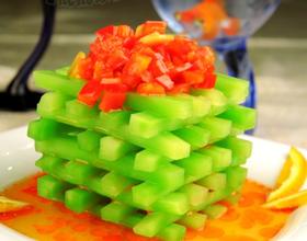将莴苣抖掉蒜末,整齐在在盘中码成塔形,浇上味汁即可。