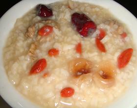 稀饭开锅放入核桃桂圆红枣继续煮。